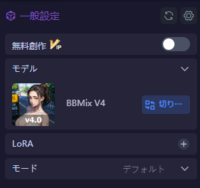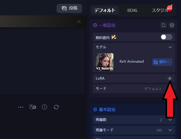 まずは、SeaArtの「画像作成モード」右側のメニューから「LoRA」を選びます。