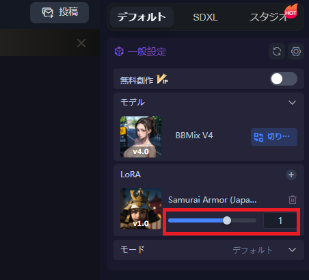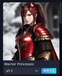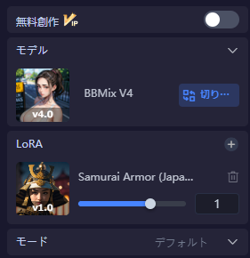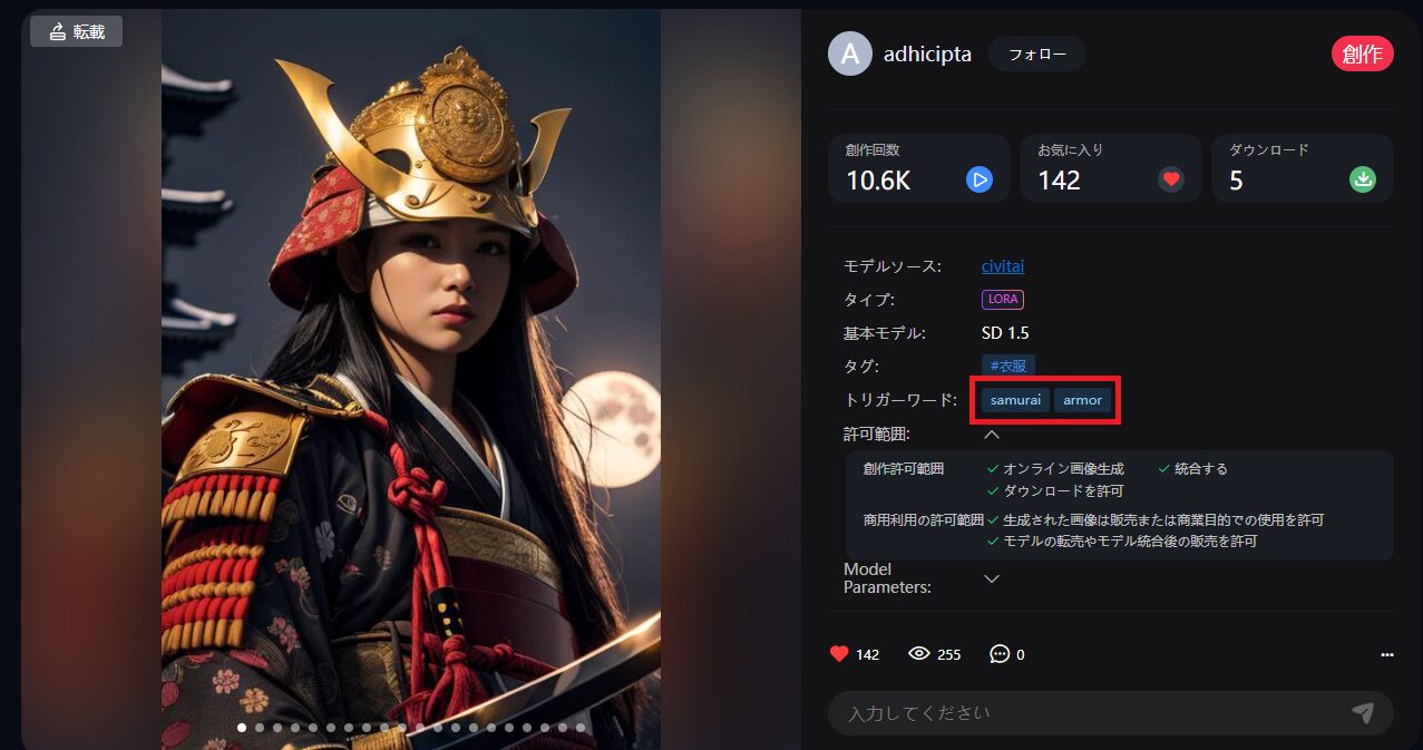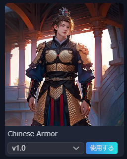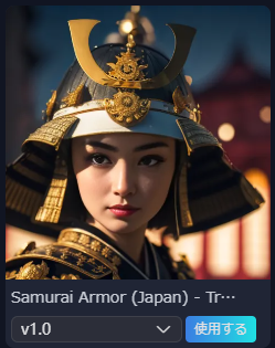 使用するLoRAモデルは、先ほども使いました「Samurai armor(Japan)」です。