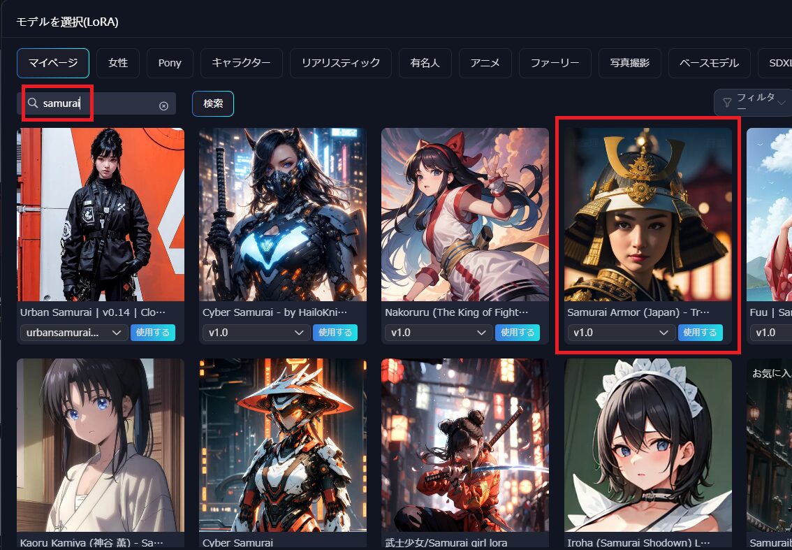 LoRAの検索バーから「samurai」と入力したら、良さげなものがあったのでそちらを使用します。